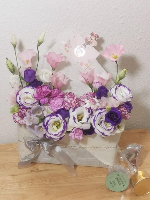 內容: 粉紅洋桔梗+紫色桔梗+雙色桔梗+雙色小康乃馨+康乃馨+風鈴花+襯花白色小雛菊
